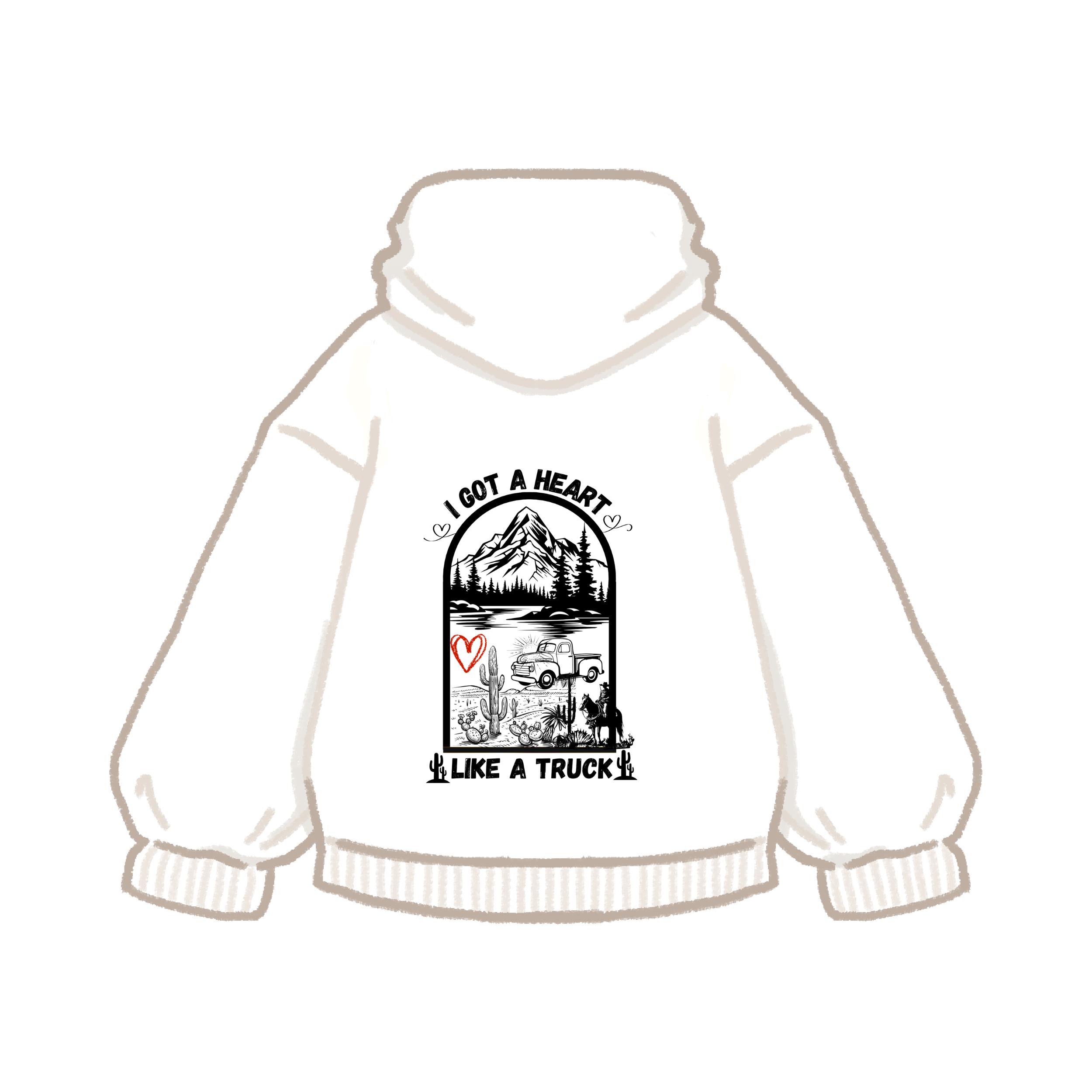 White Hoodie, Heart Like A Truck graphic. Comes in small through 3X. Only in white